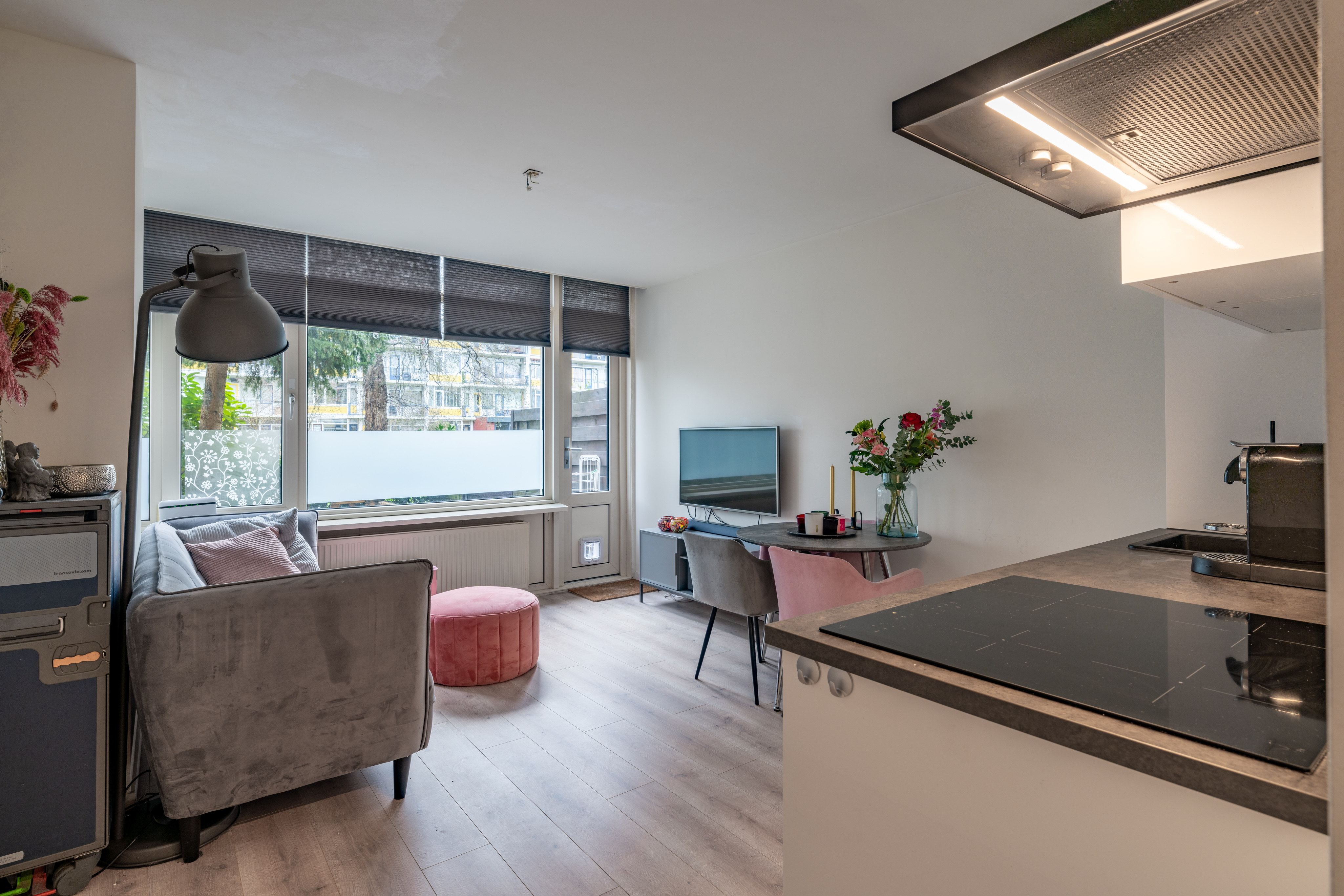 Lichte en sfeervolle woonkamer/openkeuken met inbouwapparatuur, toegang tot de tuin en vrije uitzicht.